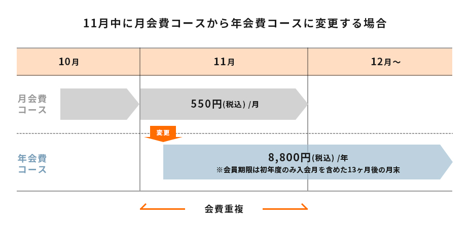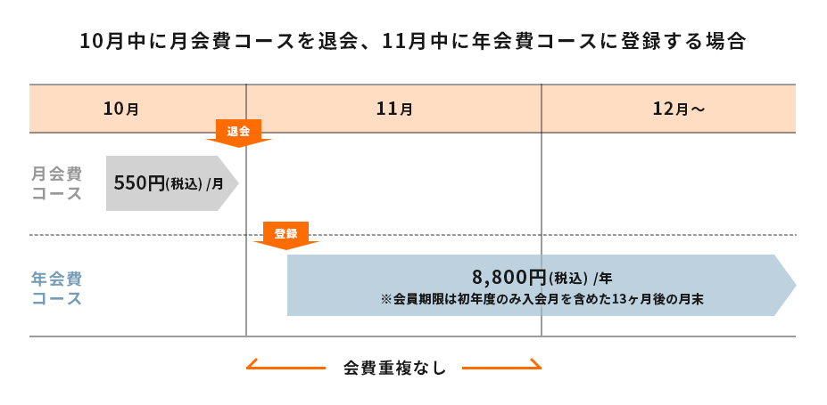 月会費コースを退会後、翌月に年会費コースに登録する場合
